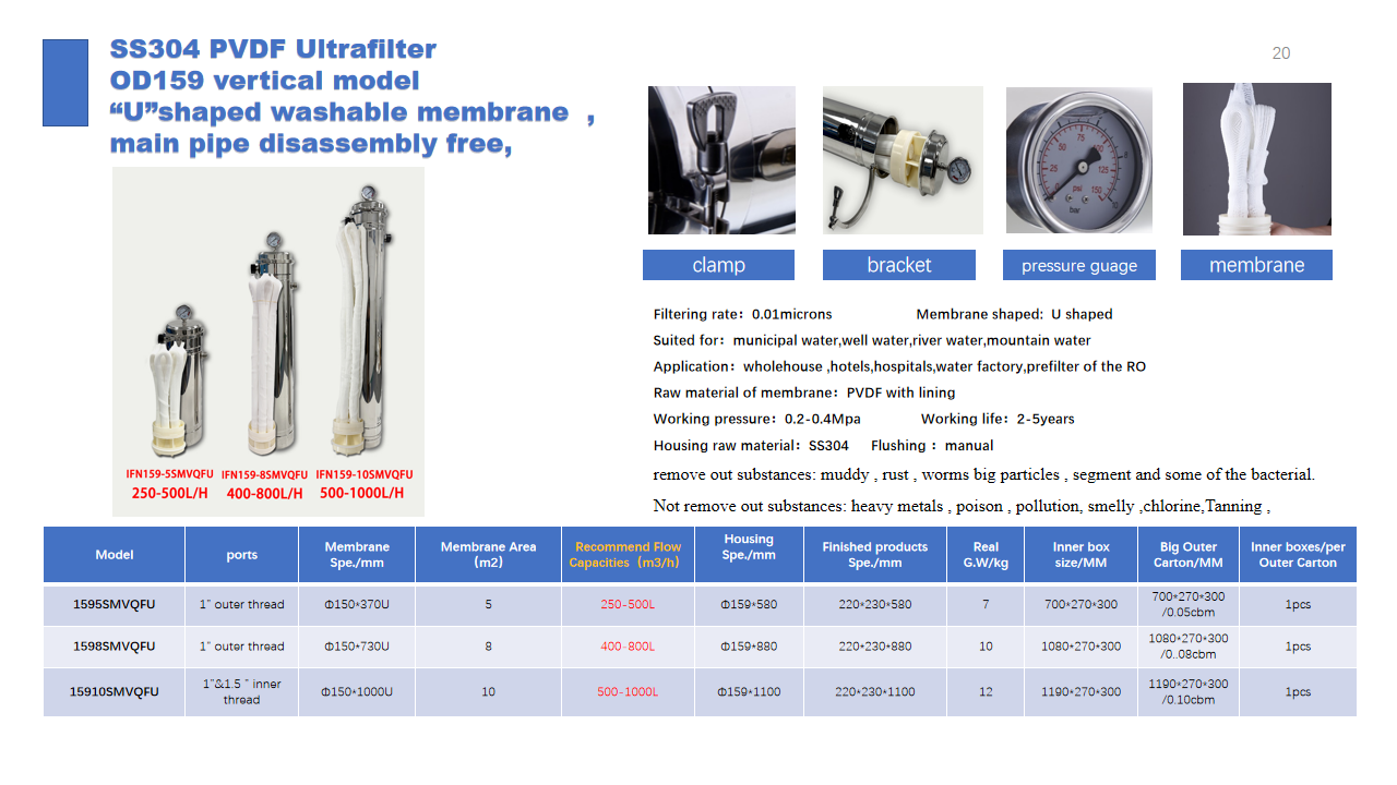 Our PVDF washable membrane filtering rate is 0.01Micron, The PVDF ultrafilter can only remove the muddy , rust , worms big particles , segment and some of the bacterial, make the cloudy water become transparent water , but it can not remove the heavy metals , poison , pollution, smelly ,chlorine,Tanning , if need to be solved these problems , need to add some other filters , such as carbon filter , or RO ,or chemicals filtration.
