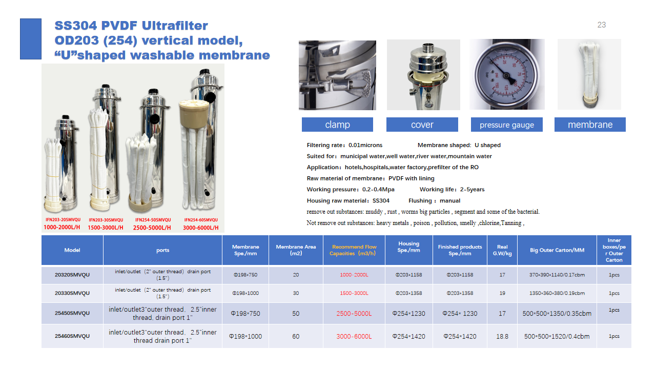 Our PVDF washable membrane filtering rate is 0.01Micron, The PVDF ultrafilter can only remove the muddy , rust , worms big particles , segment and some of the bacterial, make the cloudy water become transparent water , but it can not remove the heavy metals , poison , pollution, smelly ,chlorine,Tanning , if need to be solved these problems , need to add some other filters , such as carbon filter , or RO ,or chemicals filtration.